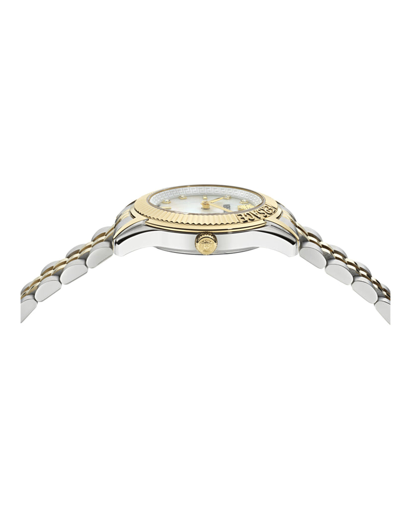 30mm TT IPYG/SS Case Two Tone Bracelet White Mother of Pearl Dial 3 ATM Deployant Buckle 8 Diamonds 0.04 ct 2 year limited warranty + 2 Swiss Made 2 Hand Quartz Movement