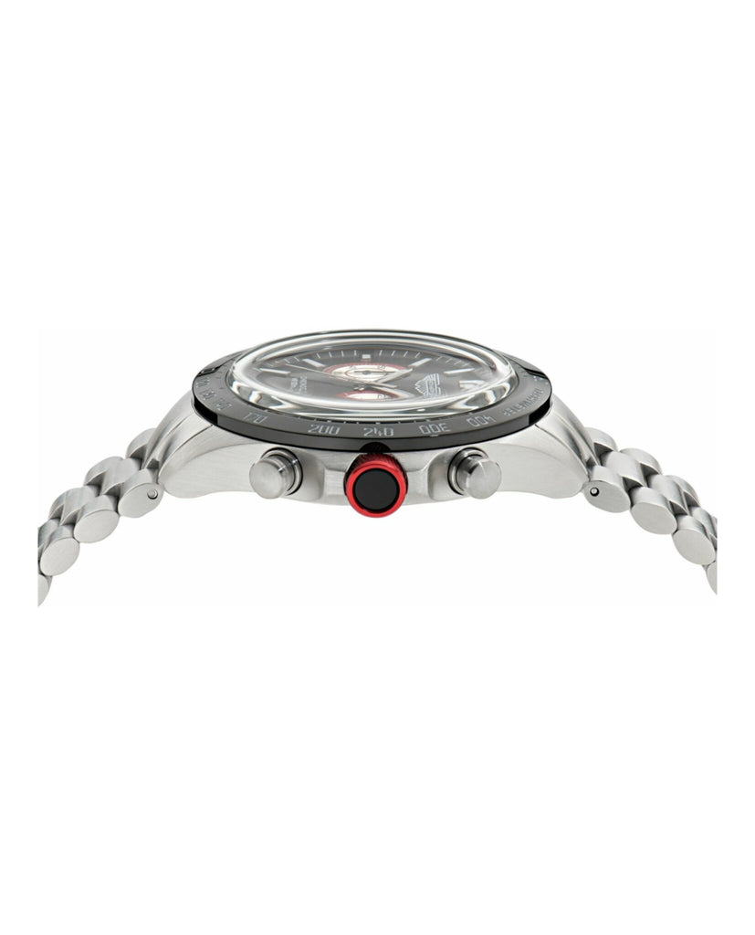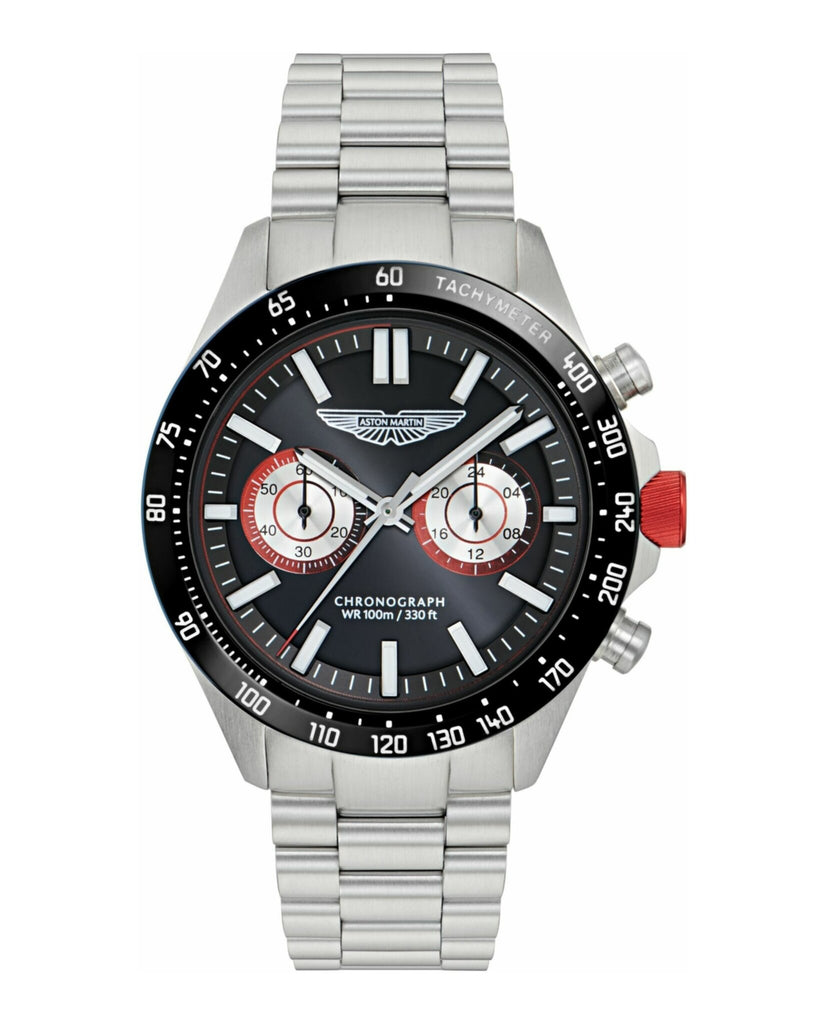Meet SPT, a chronograph built to impress.This bold 44mm RSST case matching with the bracelet houses a deep black dial with twin subdials and the Aston Martin Wings logo, delivering a strong, purposeful look. A tachymeter scale encircles the bezel for added utility, while vibrant red accents on the dial and crown infuse a dose of racing energy.
