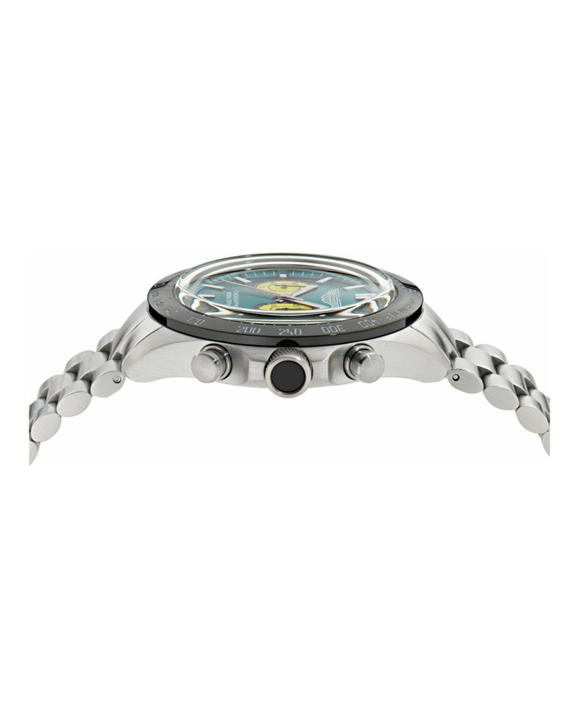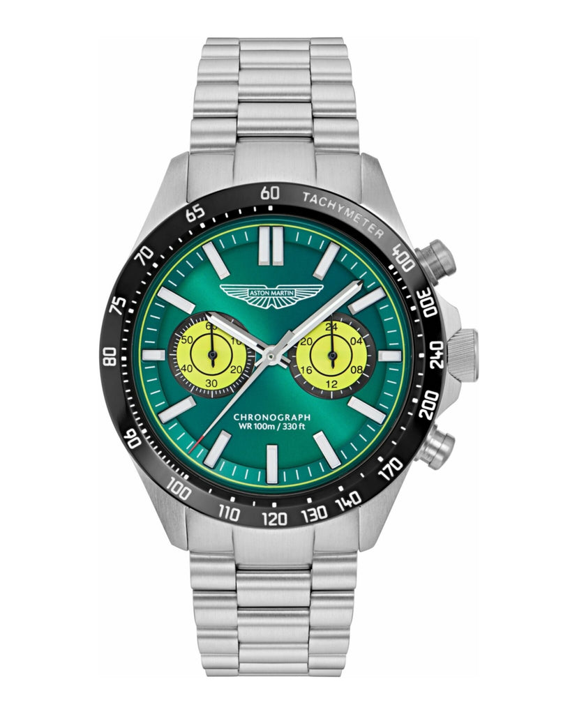 Meet SPT, a chronograph built to impress.With a bold podium green dial and contrasting subdials in Aston Martin’s lime essence hue, this version of the SPT stands out with confidence. It features a 44mm recycled stainless steel case matching with the bracelet and a black top ring with a tachymeter scale, bringing both technical edge and visual balance.