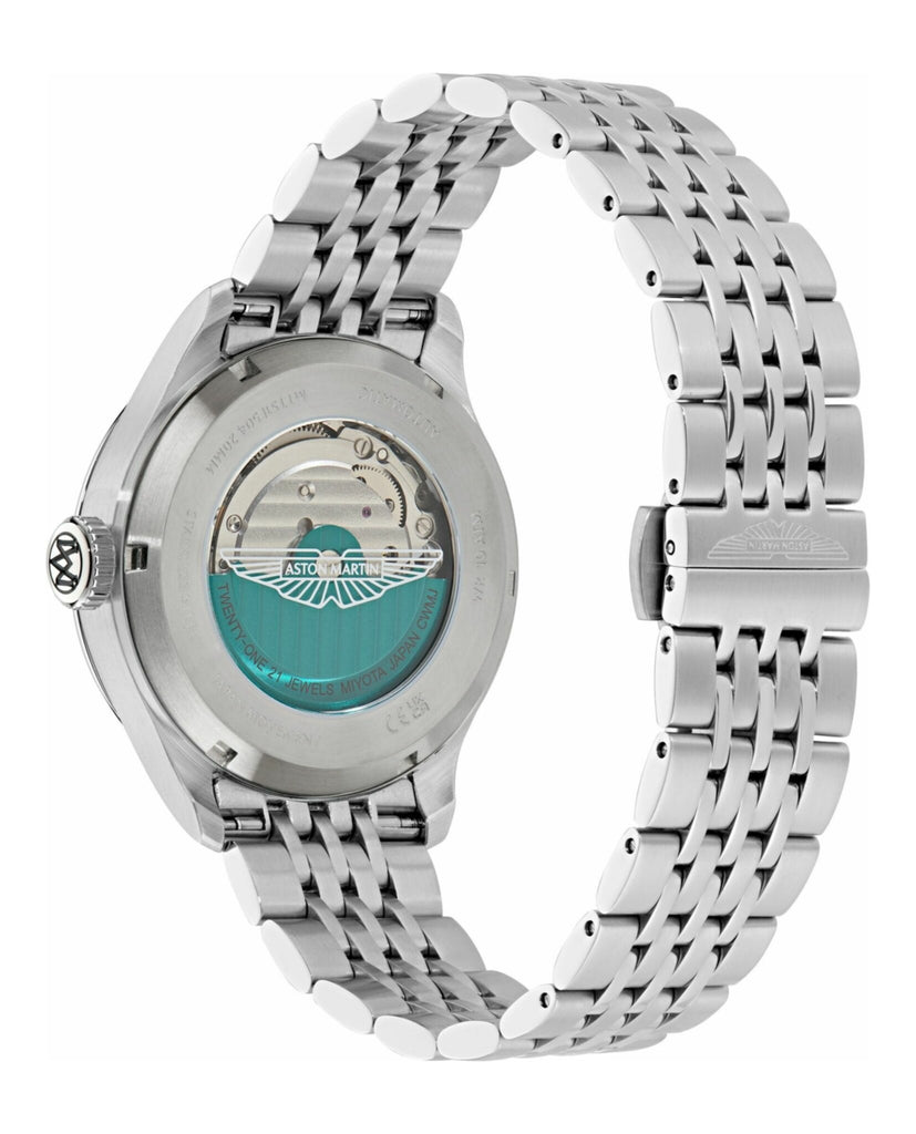 Discover the TS1 Automatic—a refined tribute to Aston Martin’s legacy. A 41mm case in recycled stainless steel houses a skeletonized podium green dial with small seconds, elegantly paired with a stainless steel bracelet. The dial features the historic 1913 Aston Martin logo and numerals inspired by classic dashboard gauges—symbols of precision and style. A transparent case back reveals the intricate automatic movement and a rotor in signature podium green, linking innovation with timeless heritage.