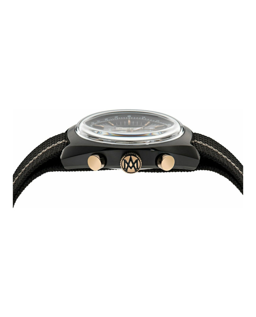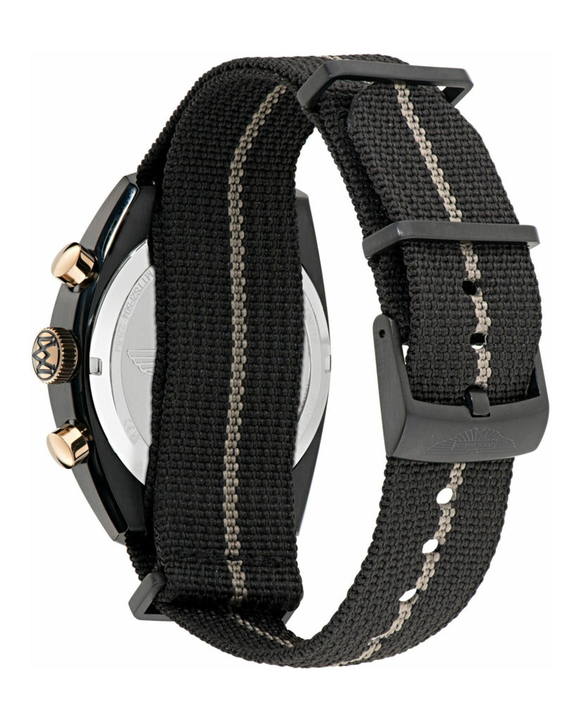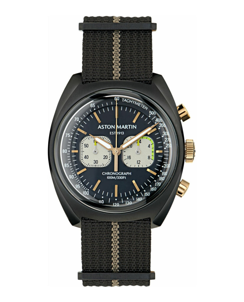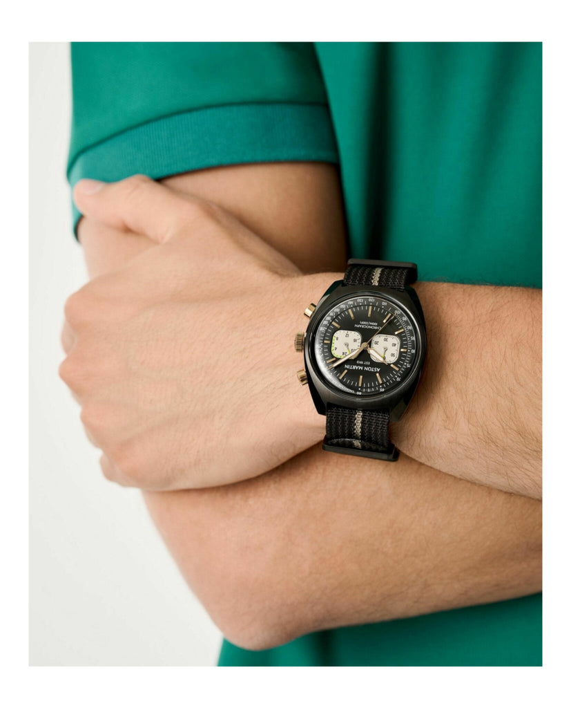 Precision-driven, crafted to shine. TS2 takes a darker, sportier turn with an all-black IP case and dial, offset by grey square subdials and a rugged nato strap in black and brown. Aston Martin 1913 logo and subtle racing cues make this piece a modern icon with legacy appeal.