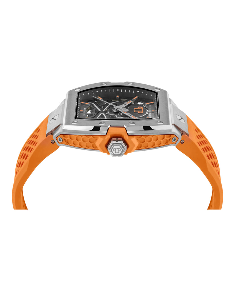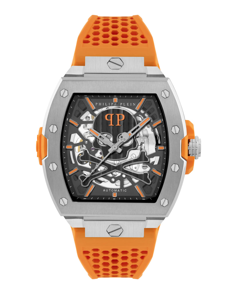 44mm Stainless Steel Case Orange Silicone Strap Grey Skeleton Dial 5 ATM Ardillon Buckle 2 year warranty 3 Hand Automatic Movement