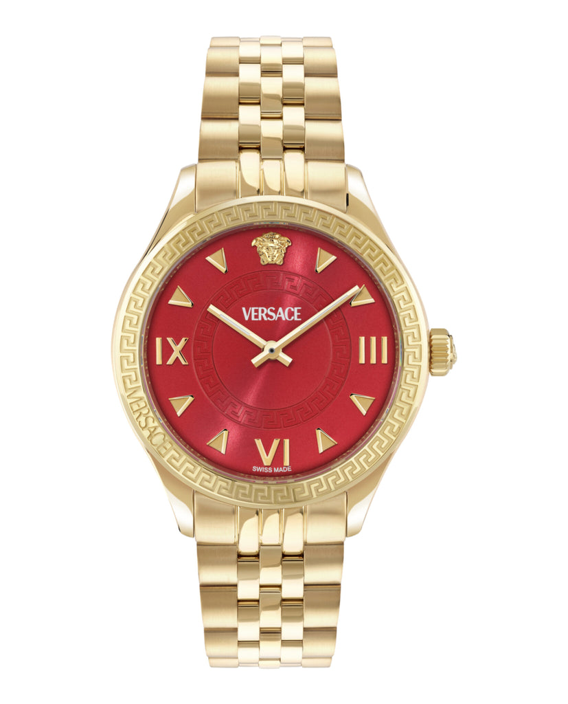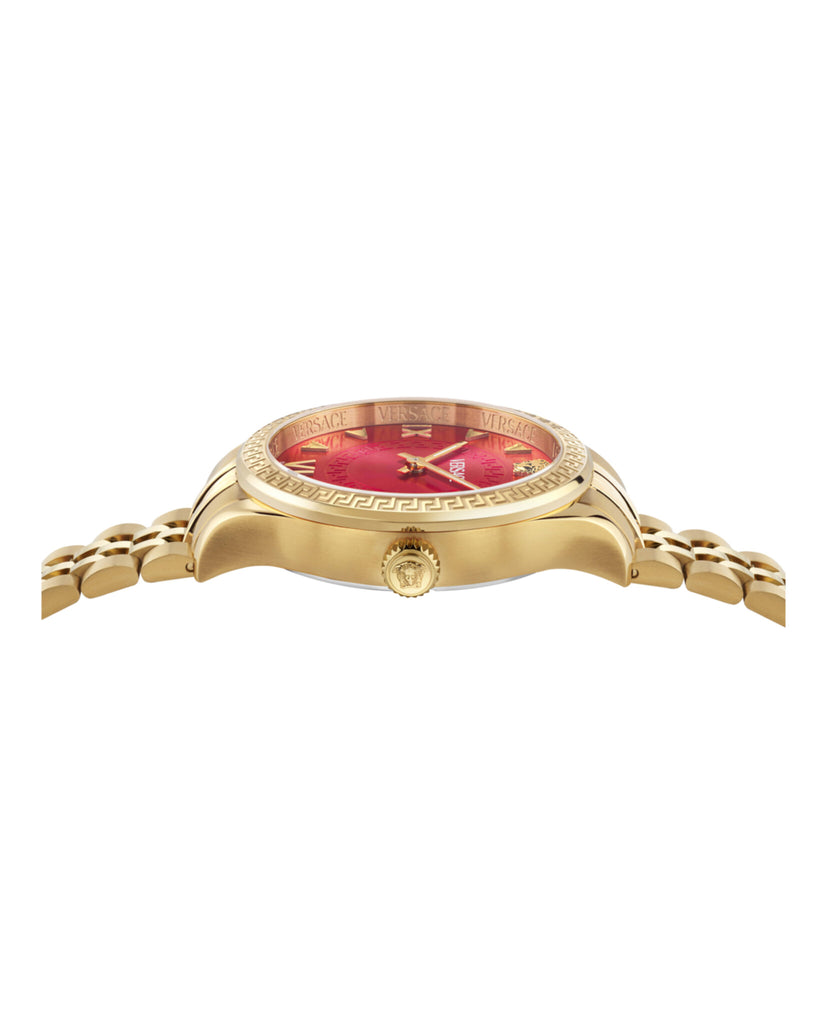35mm IP Yellow Gold Case IP Yellow Gold Bracelet Red Sunray Dial 5 ATM Deployant Buckle 2 year limited warranty + 2 Swiss Made 2 Hand Quartz Movement