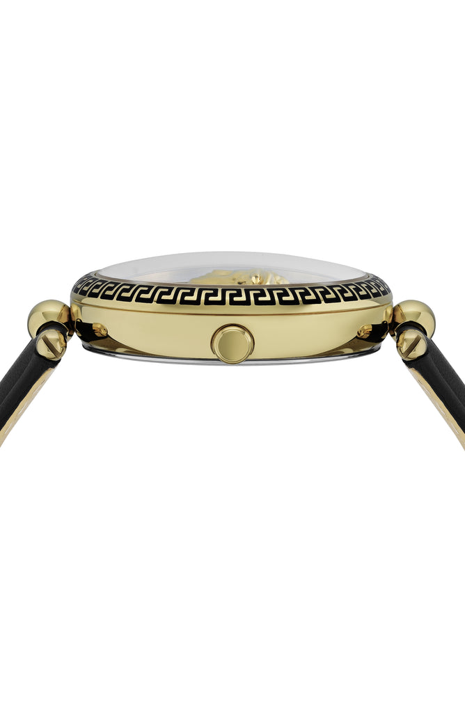 Feminine. Exquisite. Luxurious. Palazzo Empire is the Versace watches Icon. The bold 3D Medusa Head, which seems to float above the center of the dial, is positioned between two watch glasses, embellishing and enhancing the guilloché dial.