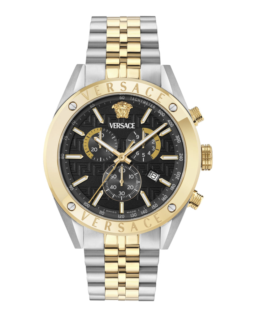 44mm Two Tone Case Two Tone Bracelet Black Guilloche Dial 5 ATM Deployant Buckle 2 year limited warranty + 2 Swiss Made Chronograph Date Quartz Movement