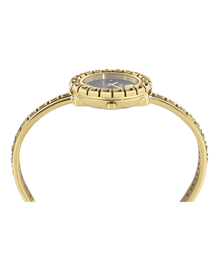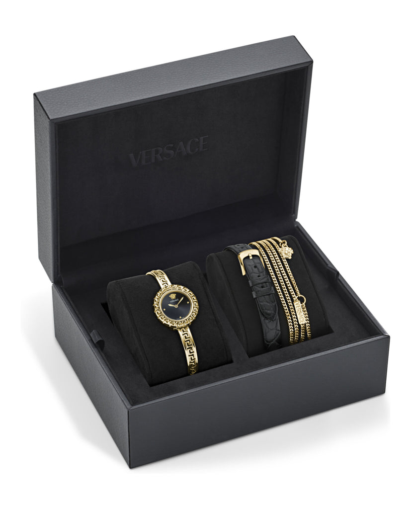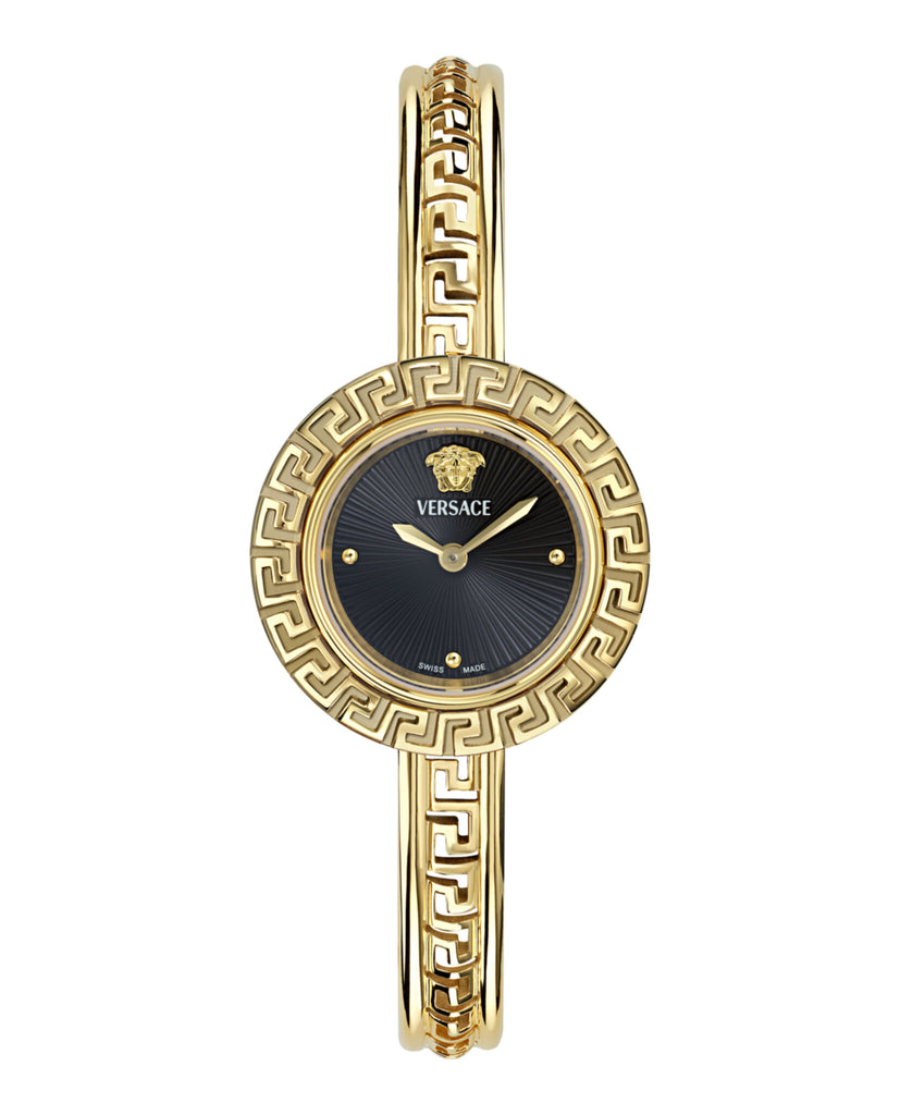 The Greca Pendant is the most elegant jewelry timepiece that offers several look combinations. It is characterized by a feminine 28mm case body shaped as an iconic tubular greca, the same motif enriches the greca shaped jewelry bracelet, that can be swapped with the leather strap, or with an iconic necklace chain for a more unique look.