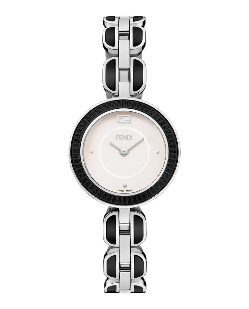 Fendi My Way 28mm Watch with White Opalin Dial; Stainless Steel Case with Black Ceramic Bezel Stainless Steel Bracelet with Black Ceramic Inserts Two Tone Bracelet Swiss Made 2 year limited warranty