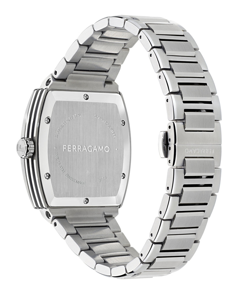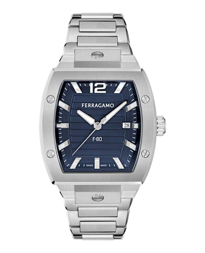 The F-80 Tonneau is a statement of bold elegance, featuring a distinctive tonneau shaped case and a guilloché finished dial that catches the light beautifully. Luminous indexes and hands ensure readability and stainless steel bracelet, reflects a balance of innovation and timeless design. With water resistance up to 100M, this watch effortlessly blends refined style with everyday versatility.
