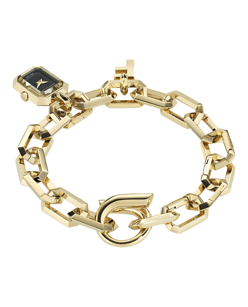 Ferragamo Charm seamlessly blends the art of watchmaking with the elegance of fine jewelry. Featuring a distinctive octagonal pendant watch design, it hangs gracefully as a charm on a bold chain bracelet. The sleek dial set within a faceted case, exudes understated luxury while the polished chain links and delicate Ferragamo logo charm add playful sophistication.