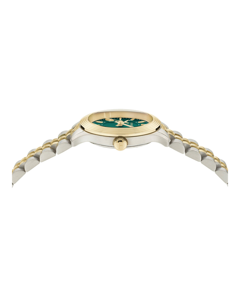 25mm Two Tone Case Two Tone Bracelet Green Guilloche Dial 3 ATM Deployant Buckle 2 year limited warranty + 2 Swiss Made 2 Hand Quartz Movement