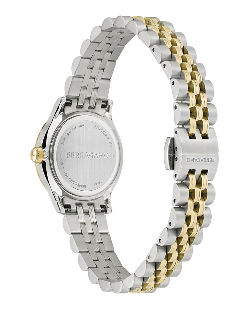 The Ferragamo Duo Mini watch is a captivating timepiece that blends style and elegance. Its small 25mm case size is beautifully complemented by a guilloché dial, adding a touch of sophistication. The dial features stud indexes, enhancing the overall elegance and providing a luxurious aesthetic.