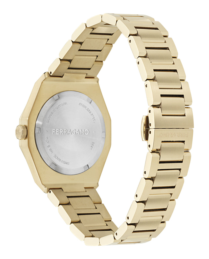Introducing the Ferragamo Edge: the latest addition to the Ferragamo timepiece collection. This new pair watch features modern and sharp lines, combined with an alluring design that is sure to captivate. The top ring, adorned with distinctive screws, adds a bold and sophisticated touch. perfect blend of elegance and innovation.
