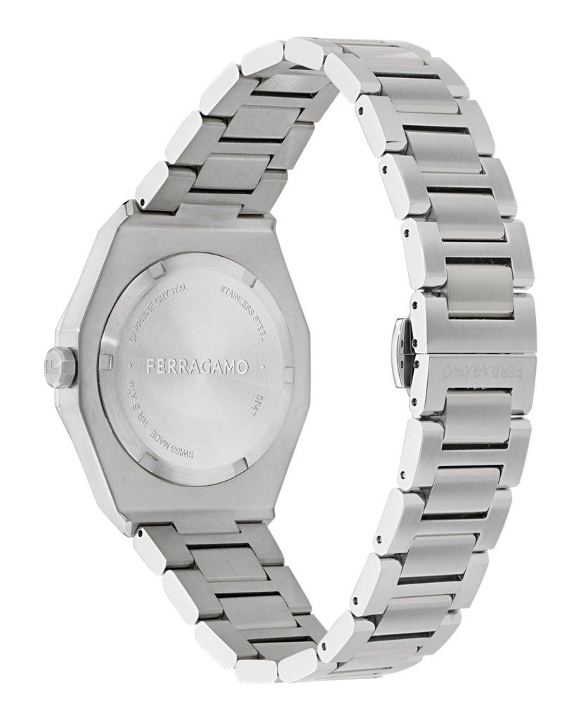 Introducing the Ferragamo Edge: the latest addition to the Ferragamo timepiece collection. This new pair watch features modern and sharp lines, combined with an alluring design that is sure to captivate. The top ring, adorned with distinctive screws, adds a bold and sophisticated touch. perfect blend of elegance and innovation.