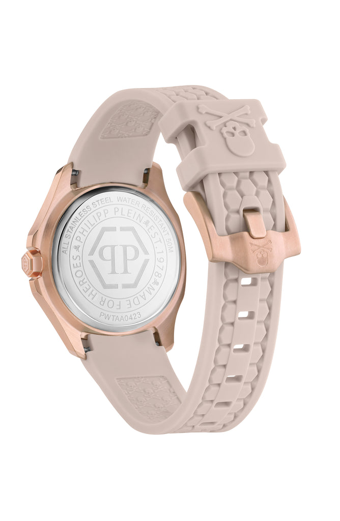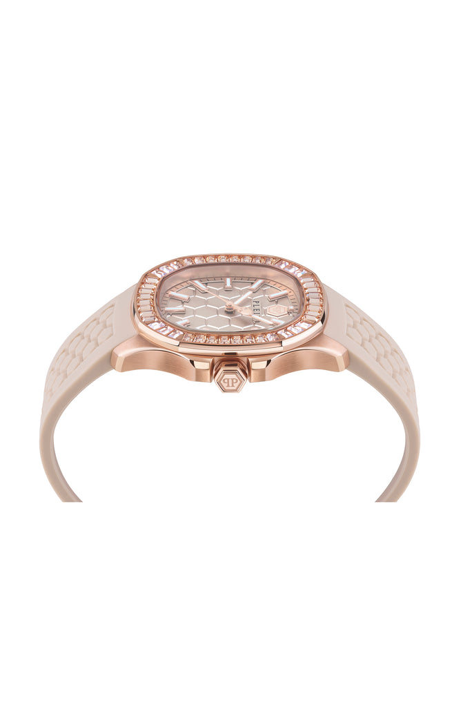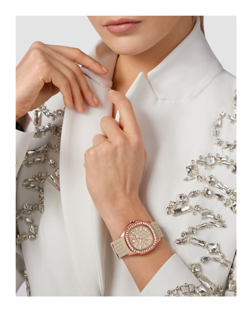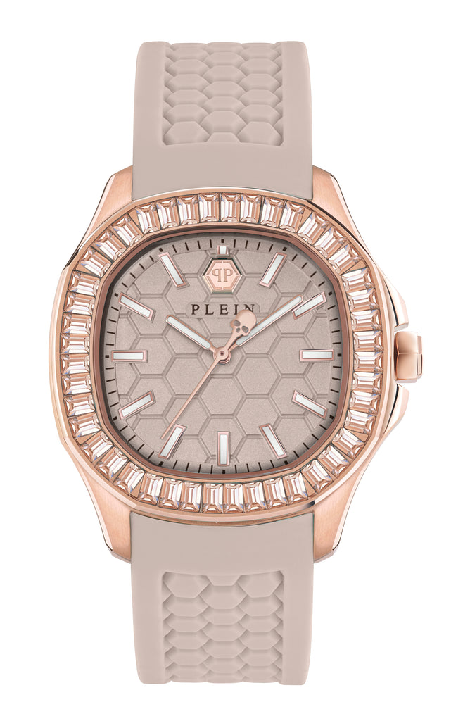 $pectre Lady is all about purity of the line. Declined for a feminine wrist, $pectre Lady epitomizes the Maison’s watchmaking, drawing on the concept of form, a taste for luxury, the precision of proportions and finally, an eye for detail. A strong and distinctive Plein DNA is conveyed by the iconic hexagonal pattern that is engraved all over the watch: on the background of the dial and on the silicone strap. $pectre Lady is available with a silicone strap or metal bracelet. Both declinations of the same design are adorned with a setting of crystal on the top ring, making it the perfect match for those who dare lead the way.