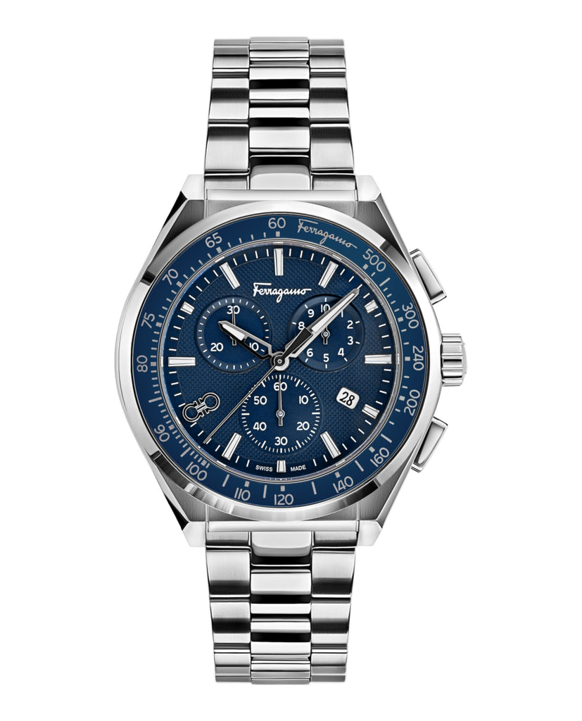 43mm Stainless Steel Case Silver Bracelet Blue Guilloché Dial 5 ATM Deployant Buckle Swiss Made Chronograph Date Quartz Movement 2 year limited warranty + 2 Swiss Made Chronograph Date Quartz Movement