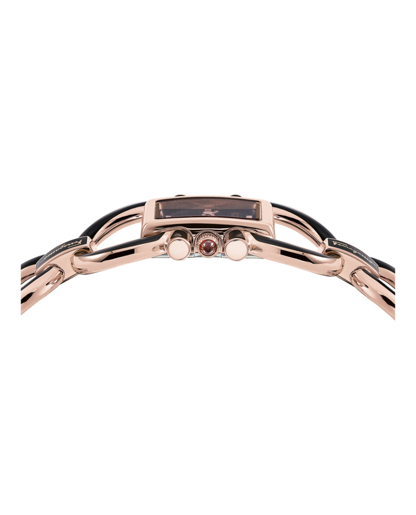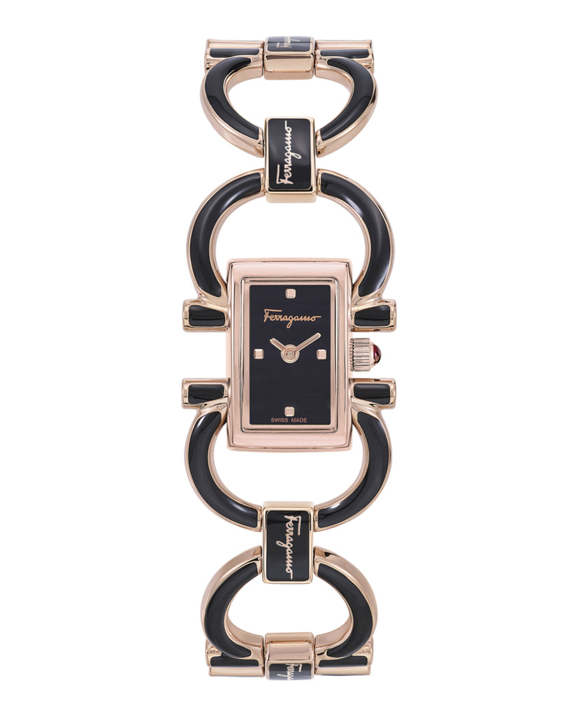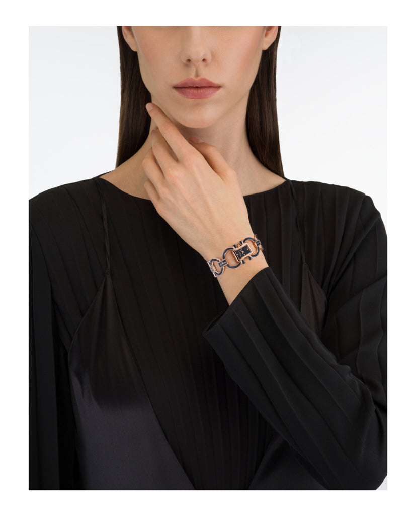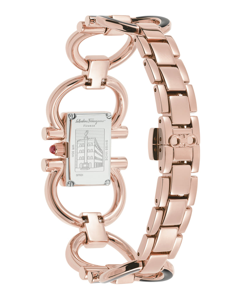 Inspired by the most iconic symbol of Ferragamo and recalling the heritage of the Maison, Double Gancini Mini watch collection has the flavor of a statement piece with a touch of glamour. The new smaller case and bracelet make it the perfect accessory for any occasion.
