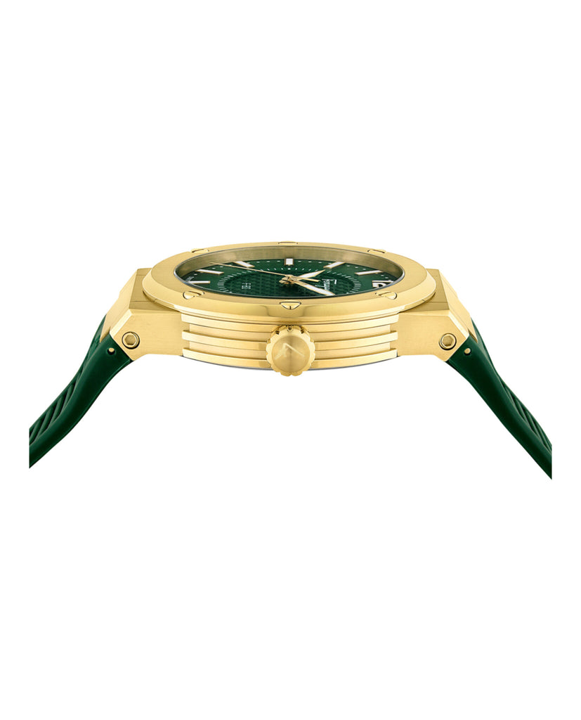 41mm IP Yellow Gold Green Silicone Strap Green Guilloché Dial 10 ATM Ardillon Buckle Swiss Made 3 Hand Date Quartz Movement 2 year limited warranty + 2 Swiss Made 3 Hand Date Quartz Movement