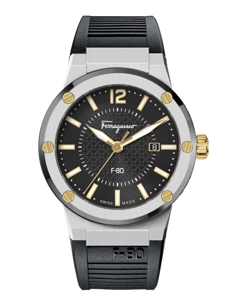 The F-80 offers even more performance and appeal. Sporty and sophisticated, it has an XL-sized case and distinctive decorative features that define the entire collection: six screws on the beze, silicone strapl and guilloché pattern on the dial.