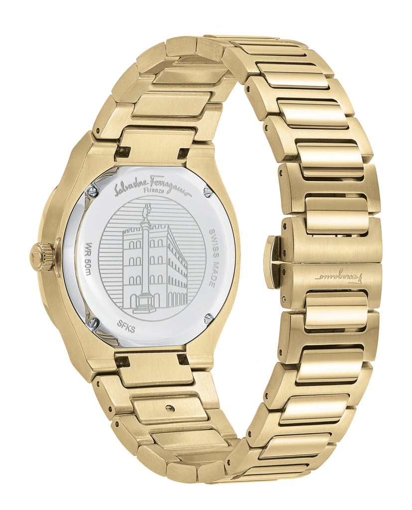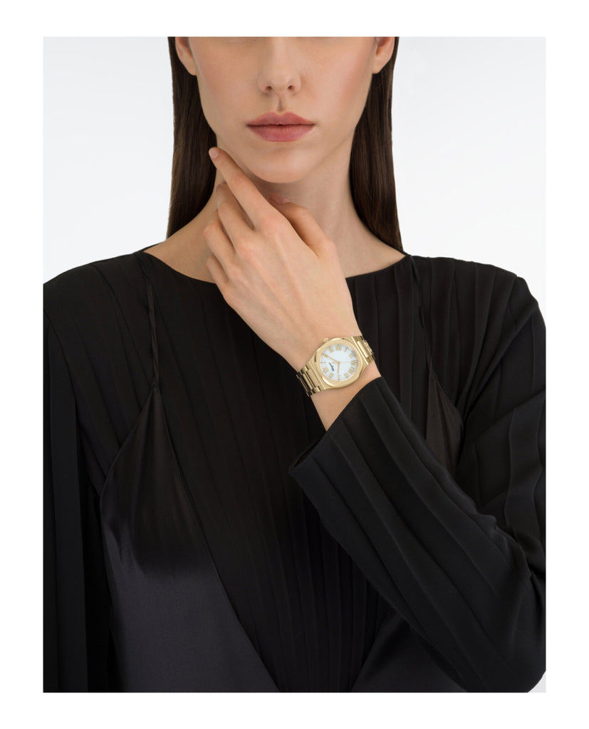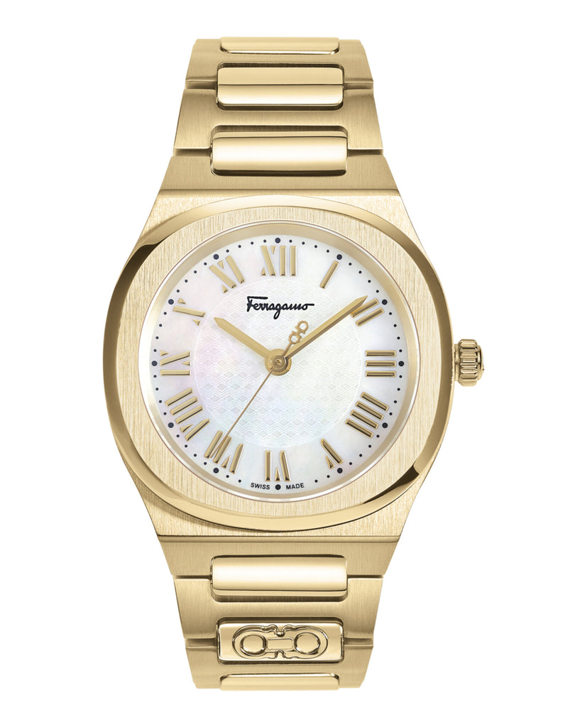 Ferragamo Elliptical is a new entry in Ferragamo's collection of watches. This timepiece has a geometric case, softened by rounded corners. THe watch features a mother of pearl dial giving a touch of femininity and refinement to this timepiece. Finally, the bracelet bears the double Gancini symbol at 6H.