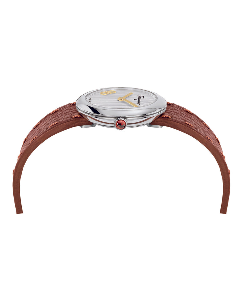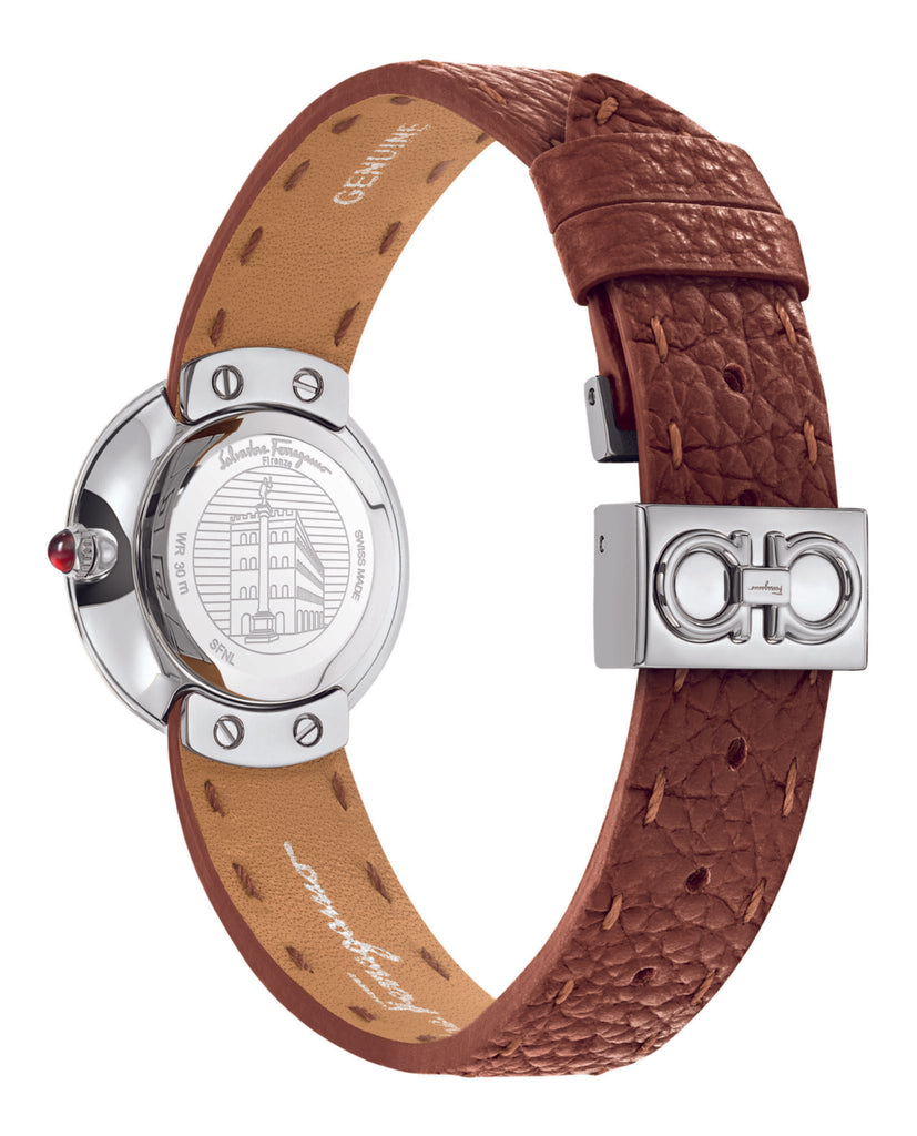Ferragamo Forever is a timepiece that celebrates the essential and refined soul of the Ferragamo Brand. The case is a modern and graceful 28 MM one. As for the dial, it is adorned with a white silver vertical stripes pattern, Ferragamo logo at 12 o’clock and the Double Gancini symbol at 8. The strap version is offered in different neutral tones in match with the Ferragamo RTW collection.