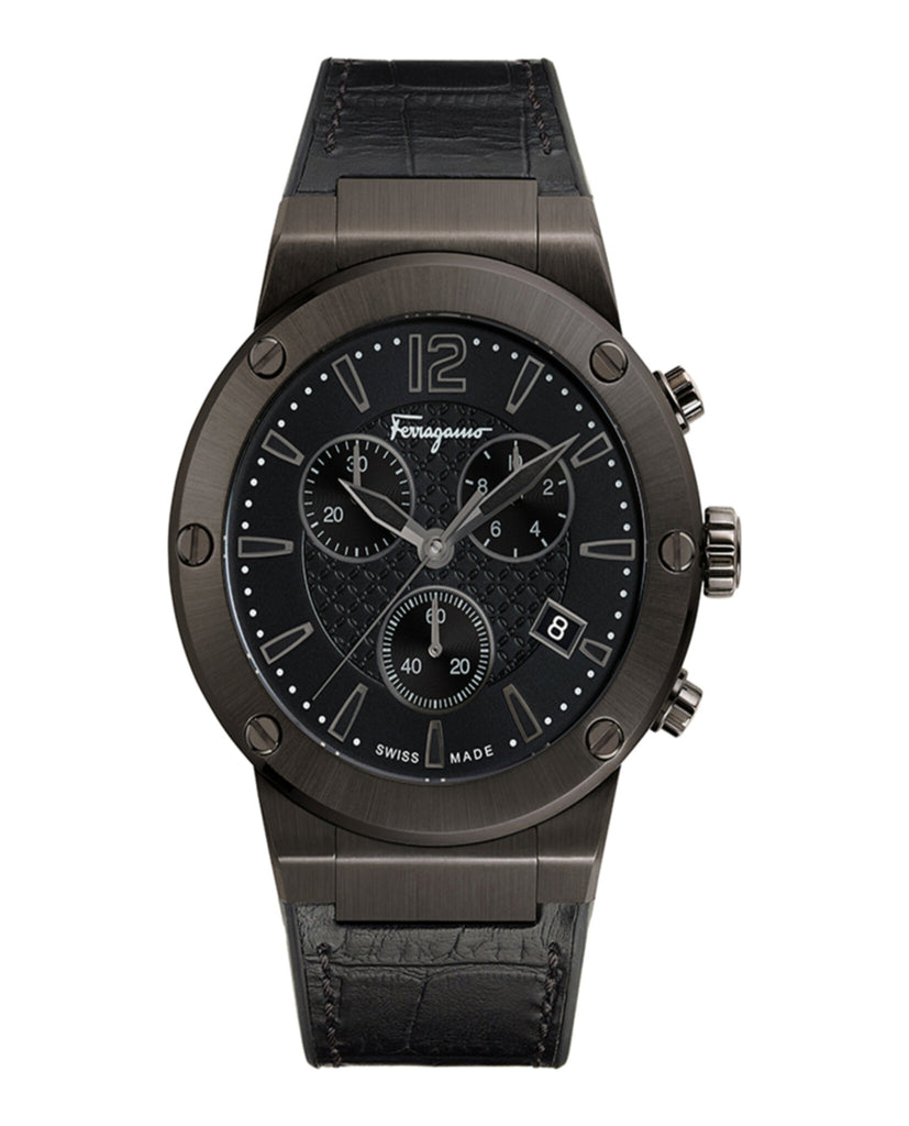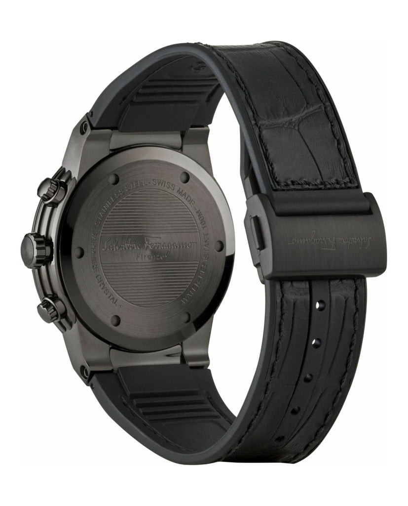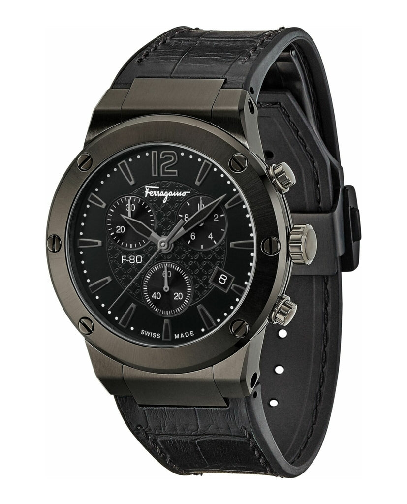 Its sport-luxury spirit has made F-80 a bestselling Salvatore Ferragamo Timepieces line. Characterized by colored leather strap combined with black caoutchouc, the F-80 chronograph mixes the strength and comfort of rubber with the softness and suppleness of calfskin, in line with the Ferragamo typical use of mixed materials and leather working heritage.