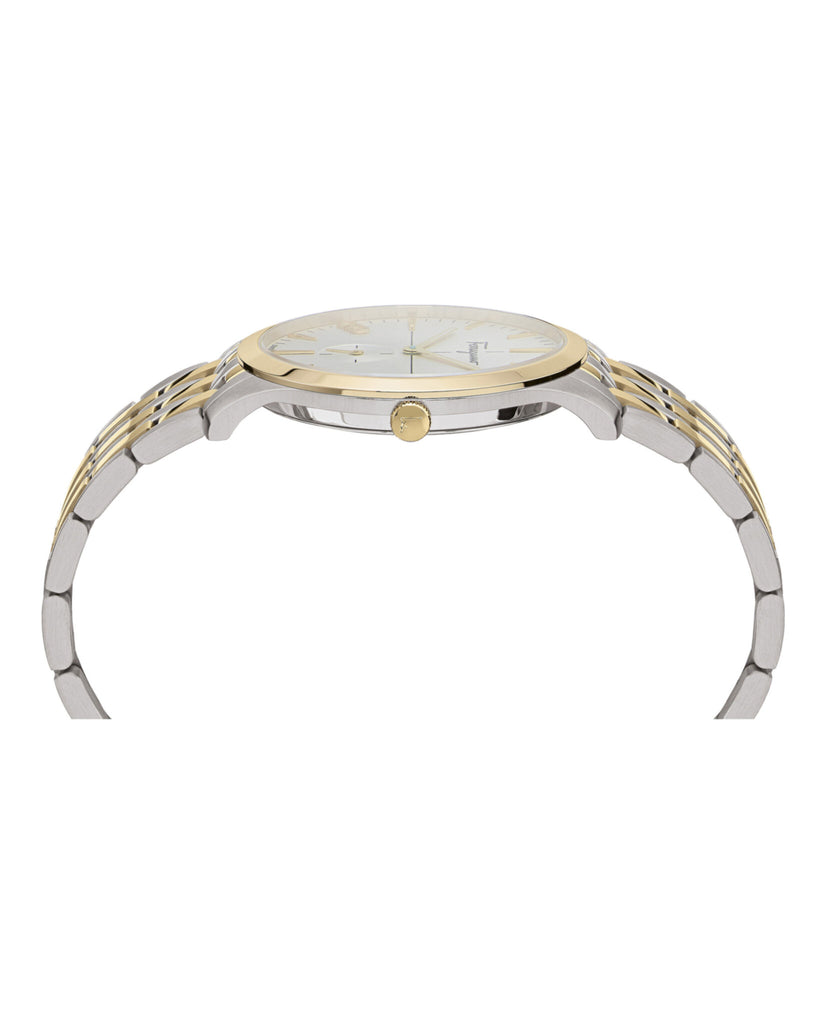 Ferragamo Slim, the thin, minimal and trendy line for him and her, becomes even more iconic flaunting the Double Gancini logo at 8 o’clock. Its look is renewed with a sophisticated alligator pattern leather strap. The polished bezel enlightens the essential and resolute sunray dial. The cross and the small seconds counter act as a counterpoint to the logo.