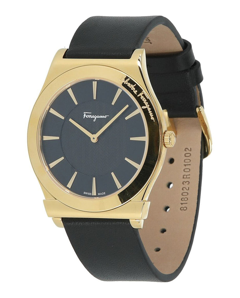 41mm IP Gold Case; Black Dial; Quartz 2 Hand Movement Black Leather Strap Swiss Made 2 year limited warranty + 2 Scratch resistant sapphire crystal