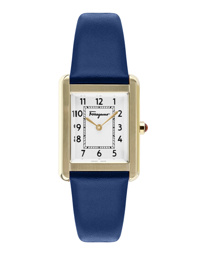 Ferragamo Portrait, the must-have rectangular dial watch. This timepiece is perfect for everyday wearing and features the Ferragamo logo at 12H.