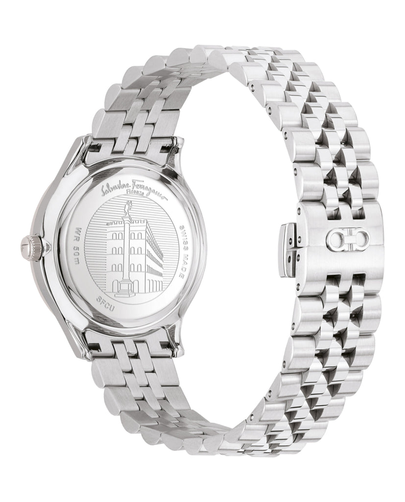 A timeless Ferragamo Timepieces best, is now relaunched with a new fashionable twist and beautiful details: Double Gancini at 8 o'clock to emphasize brand identity, a rich guilloche dial as well as trendy indexes. To complete the look a very detailed bracelet for a 24 hour use.