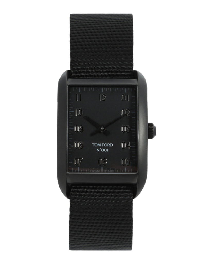 • Tom Ford 001, medium, quartz movement. Matte stainless steel with black DLC coating case and crown with onyx inlay. Matte black dial, gunmetal diamond cut hands, sapphire crystal. Case dimensions: 27mm x 40mm.. Water-resistant to 3 ATM. Swiss made.