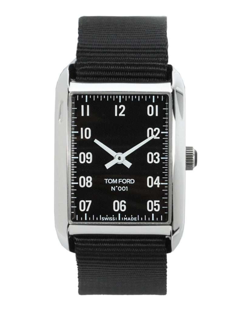 • Tom Ford 001, medium, quartz movement. Polished stainless steel case and crown with onyx inlay. Glossy black dial, diamond cut hands painted white, sapphire crystal. Case dimensions: 27mm x 40mm.. Water-resistant to 3 ATM. Swiss made.