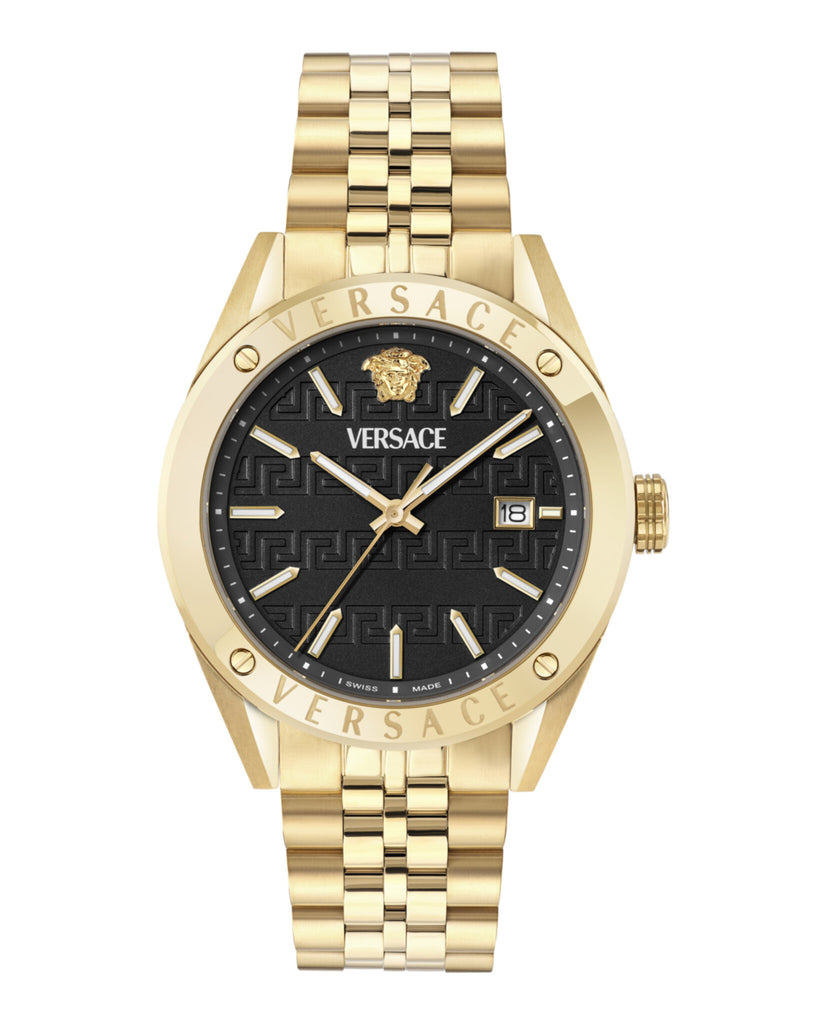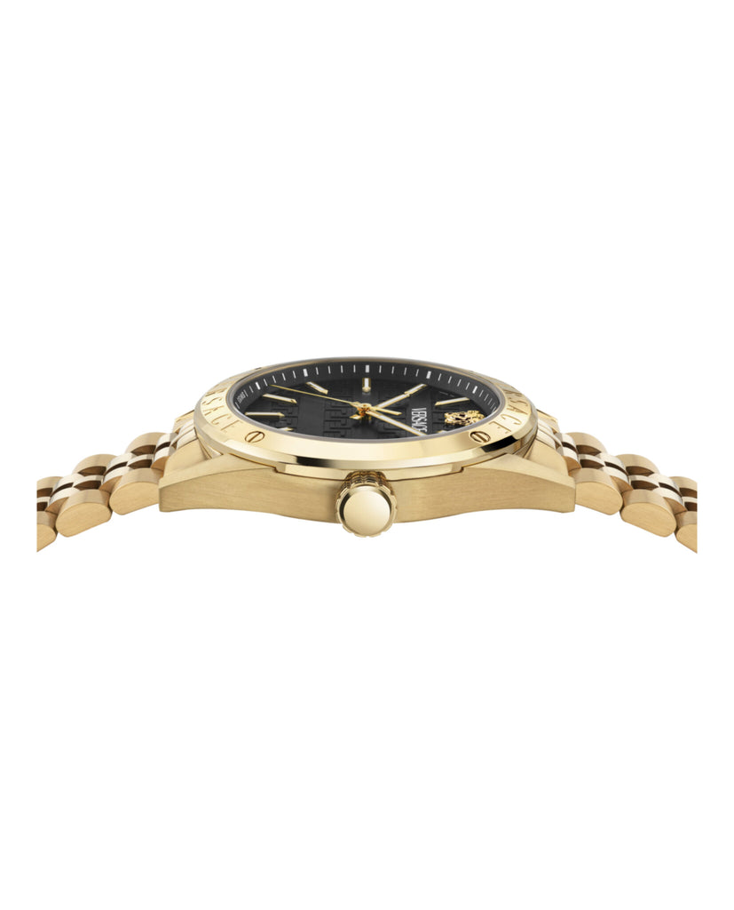 41mm IP Yellow Gold Case IP Yellow Gold Bracelet Black Guilloche Dial 5 ATM Deployant Buckle 2 year limited warranty + 2 Swiss Made 3 Hand Date Quartz Movement