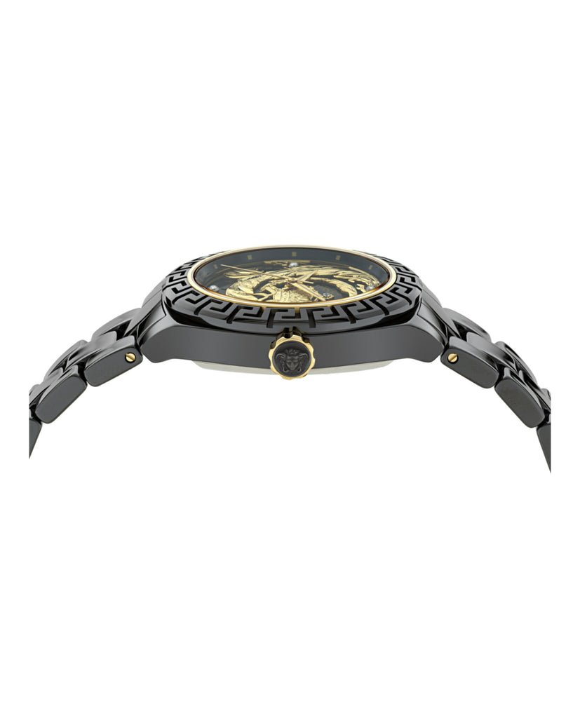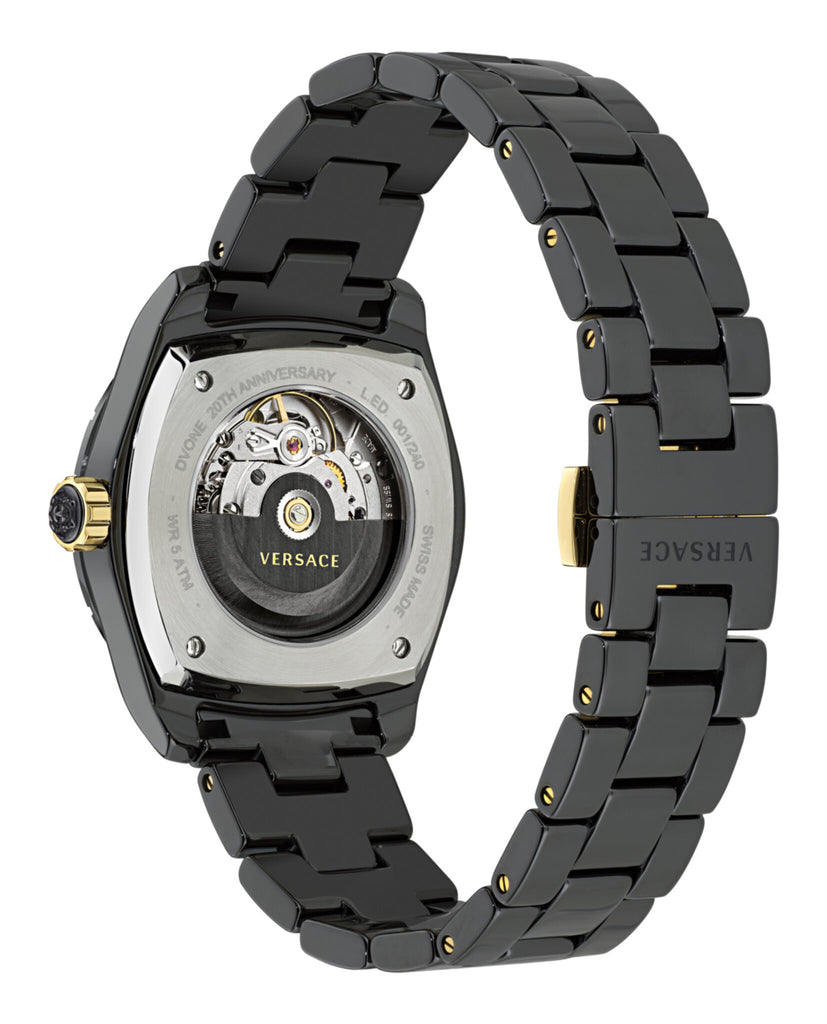 In 2025, Versace marks 20 exciting years of its collaboration with timex group, first introduced with the launch of the DV one in fall winter 2005. This milestone—spanning over 240 months and 7,305 days—is celebrated with a reimagined version of the iconic DV one. The updated design draws inspiration from the 2005 barocco pattern, blending timeless elegance with modern craftsmanship: a tribute to two decades of innovation and artistry in watchmaking. 3H Automatic movement, ceramic case, customized rotor and case back, 3D barocco yellow gold dial and 5 diamonds on indexes: these are the ingredients of this new perfect watch.