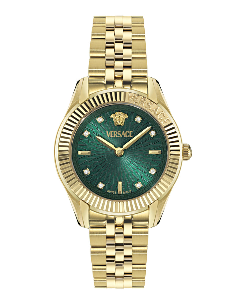 30mm IP Yellow Gold Case IP Yellow Gold Bracelet Green Guilloche Dial 3 ATM Deployant Buckle 8 Diamonds 0.04 ct 2 year limited warranty + 2 Swiss Made 2 Hand Quartz Movement