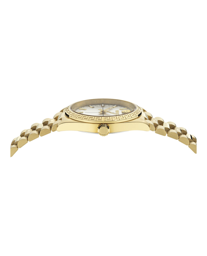 32mm IP Yellow Gold Case IP Yellow Gold Bracelet Silver Sunray Dial 3 ATM Deployant Buckle 2 year limited warranty + 2 Swiss Made 2 Hand Quartz Movement