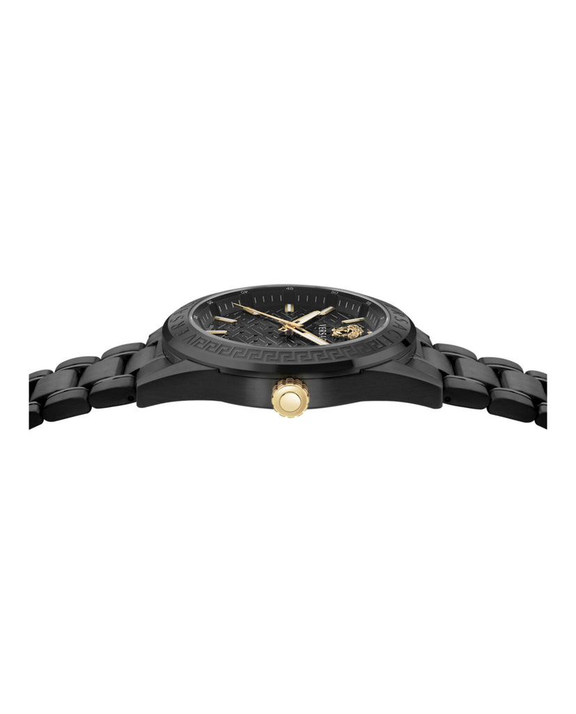 42mm IP Black Case IP Black Bracelet Black Guilloche Dial 5 ATM Deployant Buckle 2 year limited warranty + 2 Swiss Made 3 Hand Date Quartz Movement