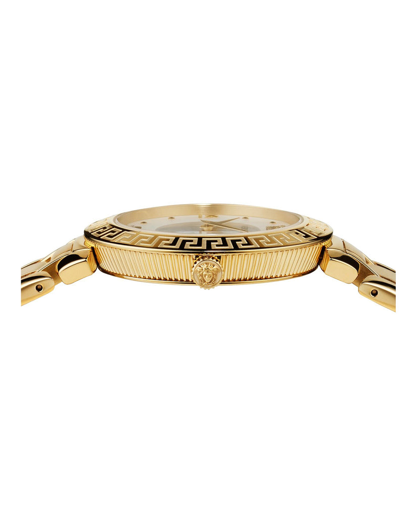 This iconic symbol of Versace is the hero of the entire construction: tone-on-tone, it crosses the enamel or mother-of-pearl dial, along the length of the strap to the top ring. In a feminine size, the new Daphnis has an original “coin” shape of the case with its lugs and with the Medusa in relief at 12 o’clock and on the crown.