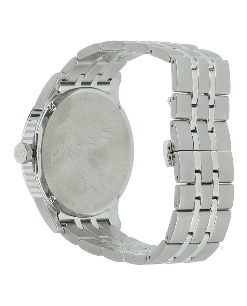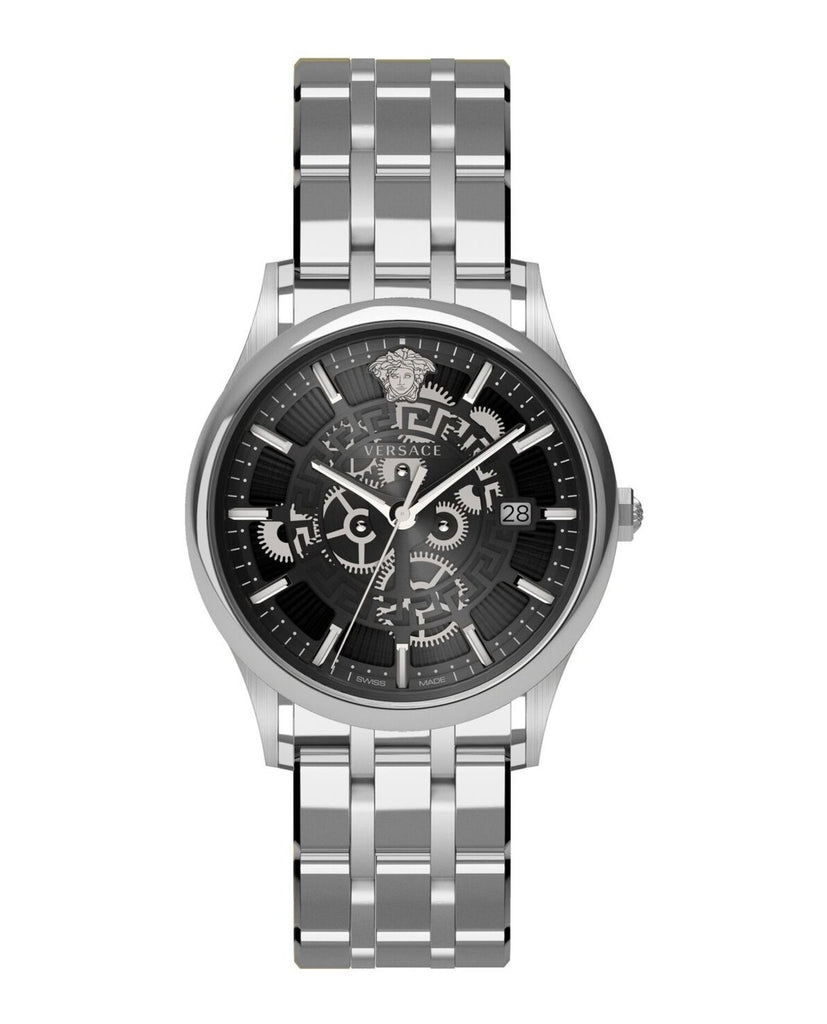 Aiakos is a “classic” timepiece; the construction reflects the principles of the best Swiss watchmaking tradition: the round case with a vintage flavor houses a precise and reliable self-winding movement with central secondhand and date display. But with Versace’s restyling the minimalist design is given a completely new twist: ultramodern proportions, a dial intersected with the iconic Greek key, a knurled case middle and biker strap all contribute to its highly appealing personality.