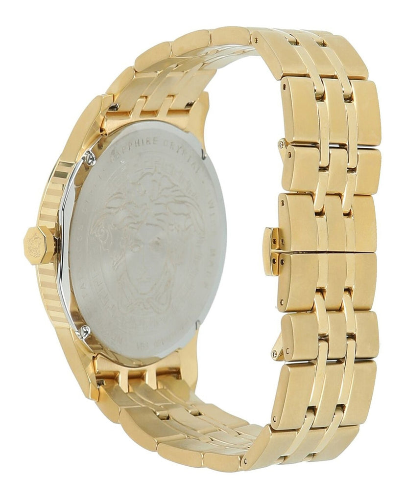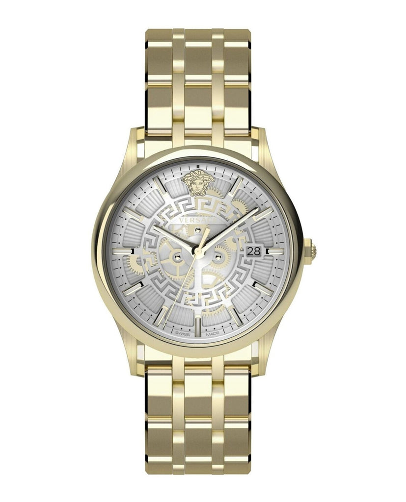 Aiakos is a “classic” timepiece; the construction reflects the principles of the best Swiss watchmaking tradition: the round case with a vintage flavor houses a precise and reliable self-winding movement with central secondhand and date display. But with Versace’s restyling the minimalist design is given a completely new twist: ultramodern proportions, a dial intersected with the iconic Greek key, a knurled case middle and biker strap all contribute to its highly appealing personality.