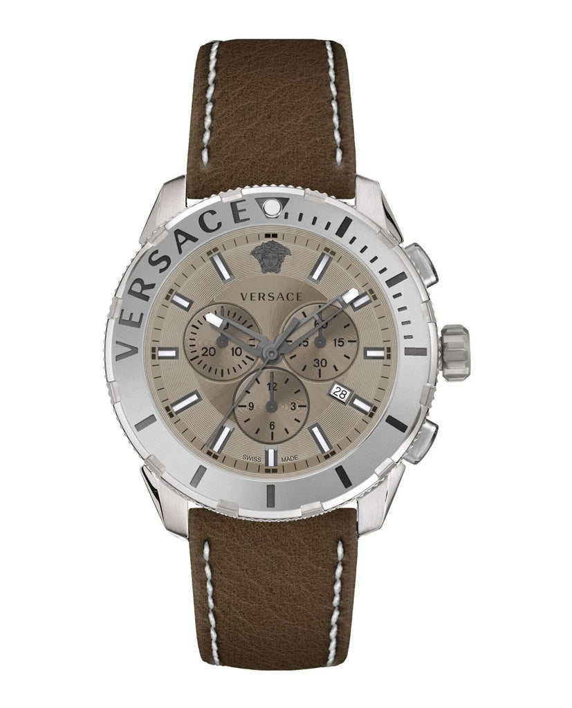 48mm stainless steel case Leather strap, brown dial Sapphire crystal with anti-reflective treatment, Quarz Chrono movement Two year limited warranty + 2