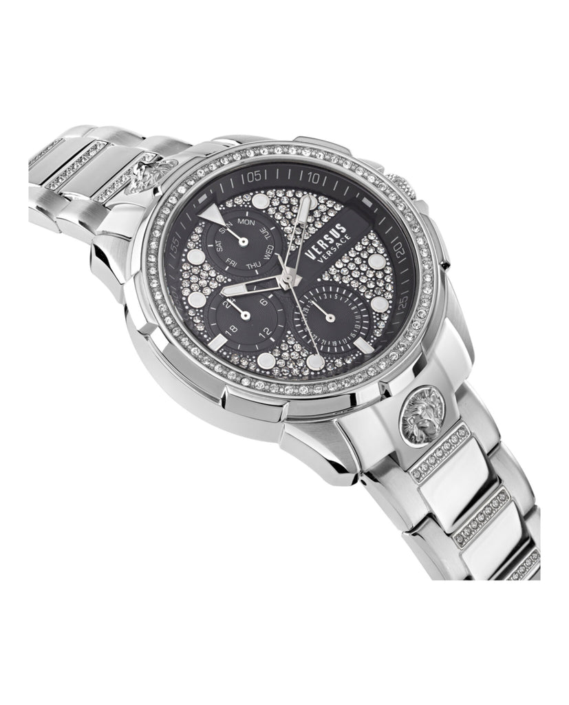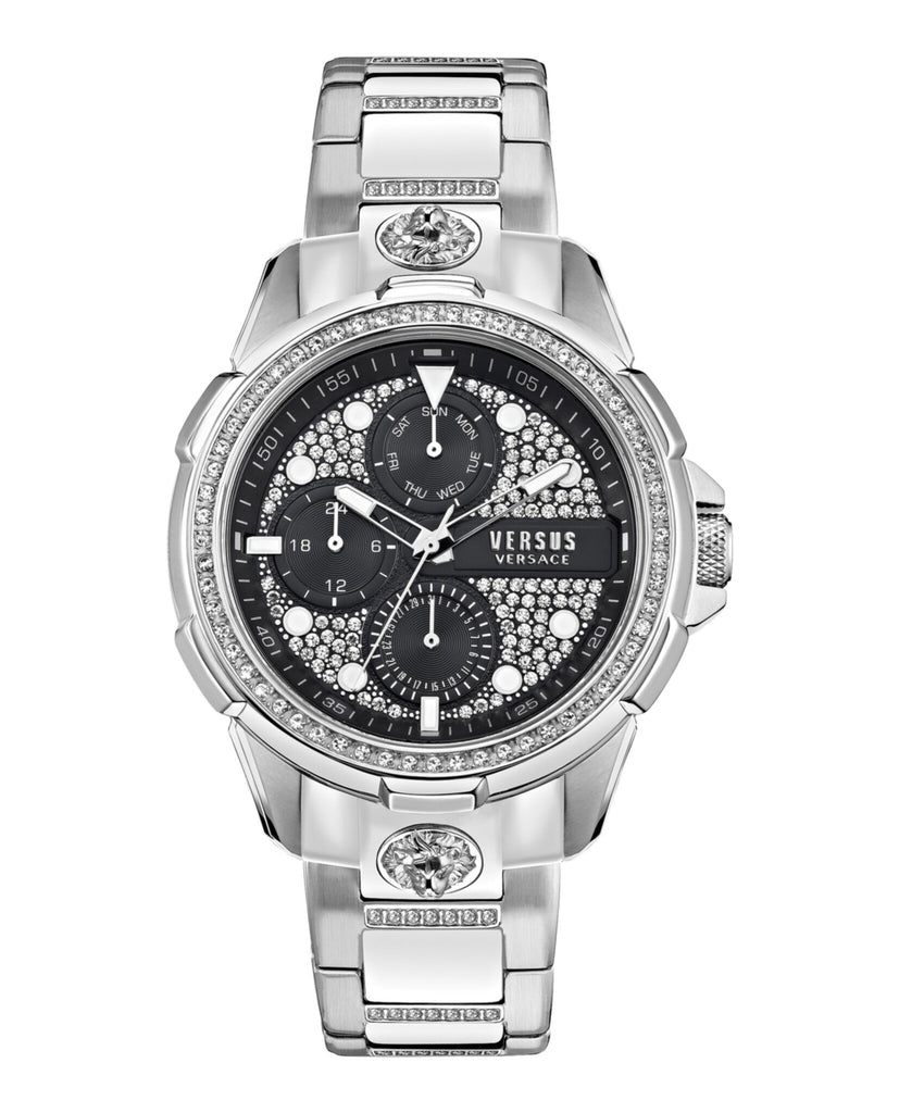 Versus 6E Arrondissement is now presented with brand new details to give a new light to mens watches. A pavé of Swarovski crystals covers the whole dial and top ring giving a dazzling and fashionable look to this successful collection for a glamour man that loves to show off. Offered in a leather strap and bracelet, Versus 6E Arrondissement is now cooler than ever.
