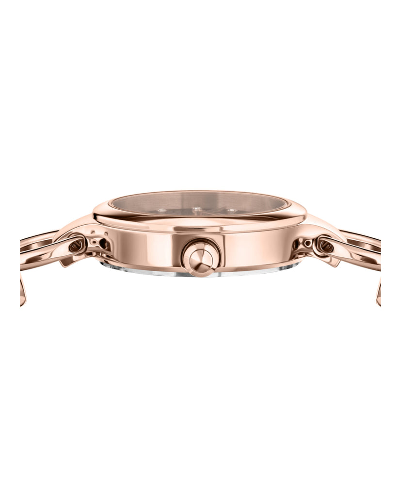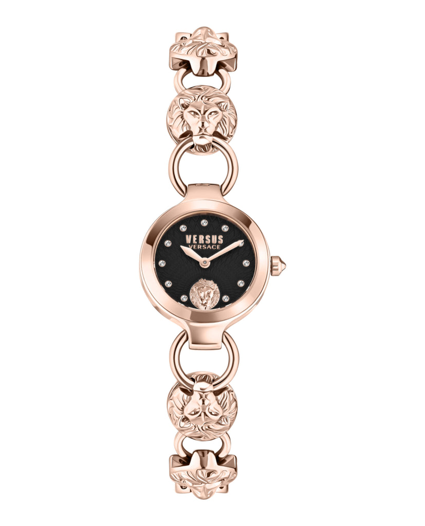 Jewelry inspiration for Versus Broadwood where interconnected Lion Heads create a rich and sophisticated bracelet. A unique enamel dial with Swarovski crystals as indexes give to this watch a very precious look.
