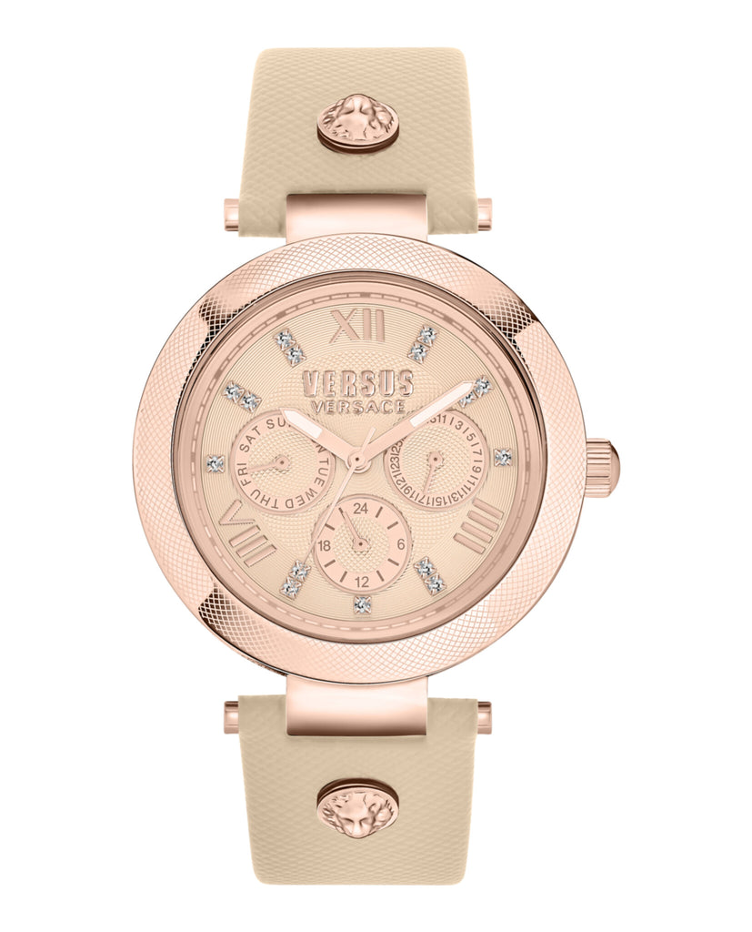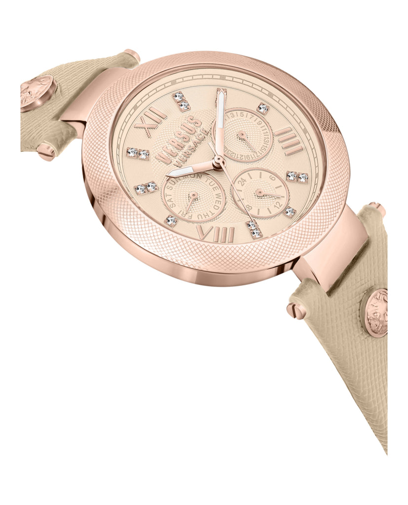 38mm Rose Gold Case Beige Strap Beige Enamel Dial 5 ATM Ardillon Buckle Quartz Multifunction Movement 2 year limited warranty