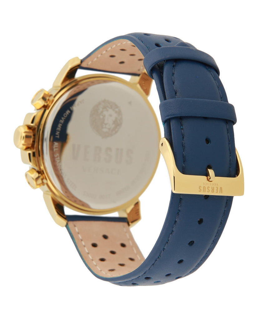 45mm IP Yellow Gold Case; Blue Dial; Quartz 3 Hand Movement Blue Leather Strap Imported 2 year limited warranty 3 Hand Quartz Movement