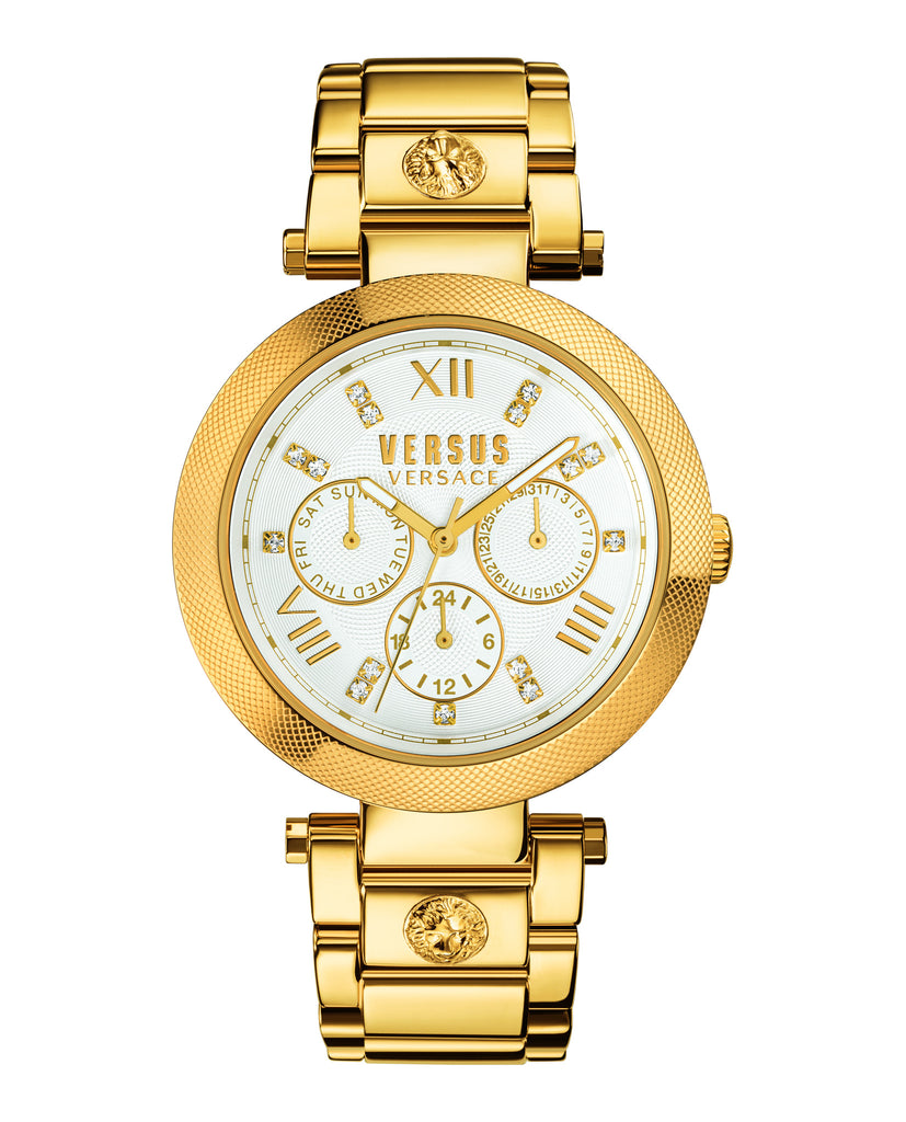 Line extension of an ever green collection. Versus Camden Market has a boyfriend case body with a multifunction movement and Swarovski crystals embedded on top ring. The 3 counters give to this watch a sportif&chic look & feel. Lion head at 12 and 6 on the bracelet to emphasize the brand DNA.