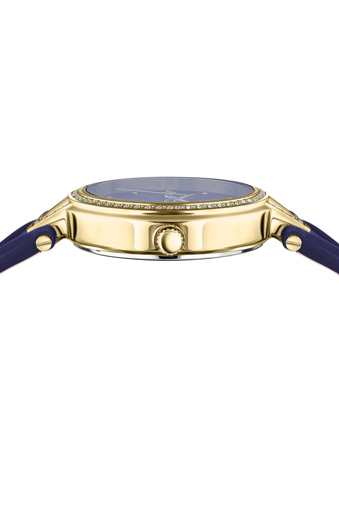 34mm IP Yellow Gold Case Blue Leather Strap Blue Enamel Dial 3 ATM Ardillon Buckle 3 Hand Quartz Movement 2 year limited warranty
