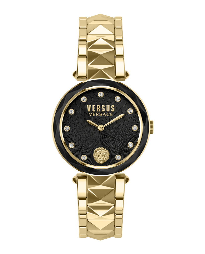 Simple but sophisticated. Chic but surprising. Versus Covent Garden is an original timepiece with refined and unusual detailing. The top ring is faceted like a precious stone and reflects light harmoniously. The guilloché dial features a lion head in relief, set against a background with a geometrical pattern. The stud-shaped indexes add to the iconic status of this watch, alongside the matelassé leather strap or, alternatively, a bracelet with stud-shaped links.