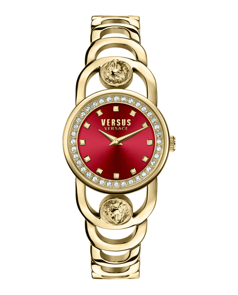 32mm IP Yellow Gold Case; Red Dial; Quartz 2 Hand Movement Gold IP Yellow Gold Bracelet Imported 2 year limited warranty Scratch resistant mineral crystal
