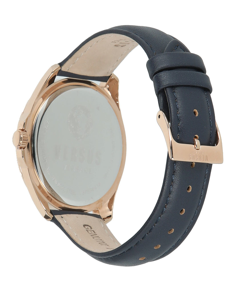 40mm IP Rose Gold Case; Blue Dial; Quartz 3 Hand Day, Date, 24h Movement Blue Leather Strap Imported 2 year limited warranty Scratch resistant mineral crystal