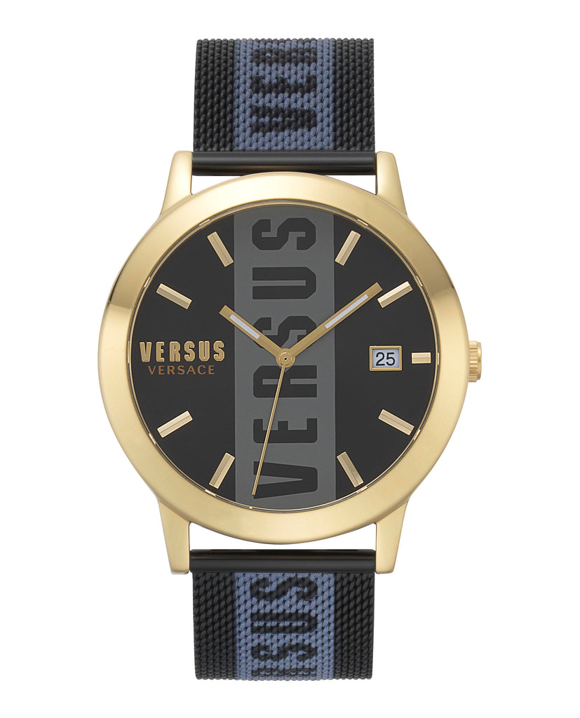VERSUS Versace Barbés is a glamorous watch full of brand DNA. Texture on the strap and the dial gives this watch an edgy feel. 44mm slim case body enriches the look of this collection.